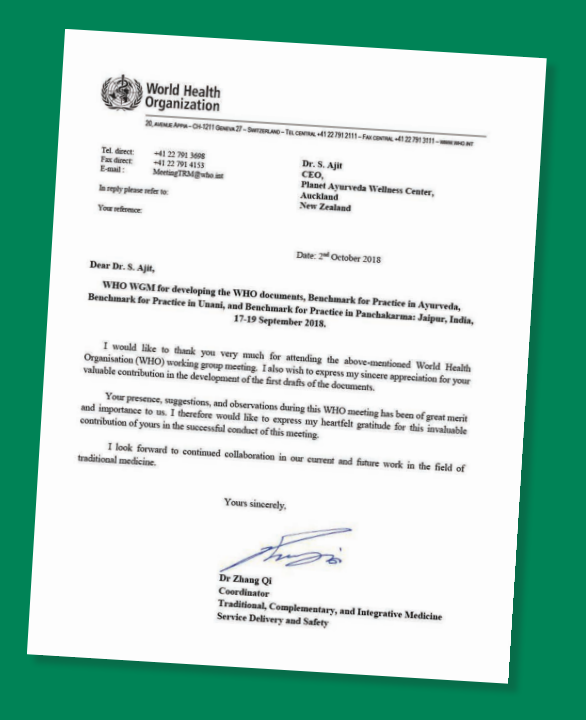 Dr Ajit has developed TGA approved Ayurvedic Herbal Formulations, has contributed to the W.H.O working group documents – Benchmark for Practice in Ayurveda
